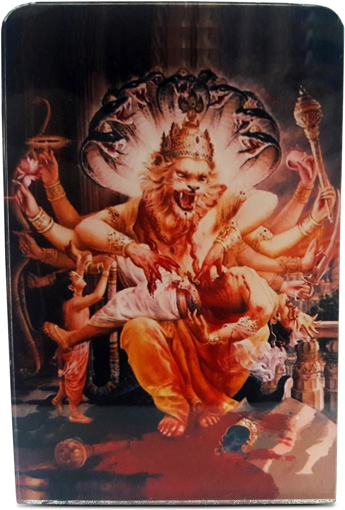 These nice quality Acrylic Nrsimhadeva Killing Hiranyakasipu Stands are 2" x 3". You can put one on an altar in a temple or home. You can also get one for your workplace desk to remind you of Lord Nrsimhadeva throughout the day.