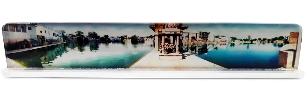 These nice quality Radha Kunda Acrylic Stands are 6.1" wide by 1" high (inches). You can easily fit one on an altar in a temple or home. You can also get one for your workplace desk to remind you of Radhakunda throughout the day.