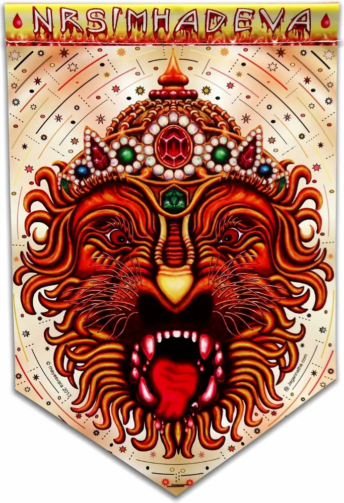 BeautifulArt Flagwith the name and picture ofLord Nrsimhadeva. Can be put in your temple, home or garden to decorate the space and remind people of Lord Nrsimhadeva. The flag is approximately 10" wide X 15" tall and has an explanation about Lord Narasimha on the back. A 1.25" loop near the top allows for hanging on a horizontal flag pole or rope. Made from heavy vinyl suitable for the outdoors!