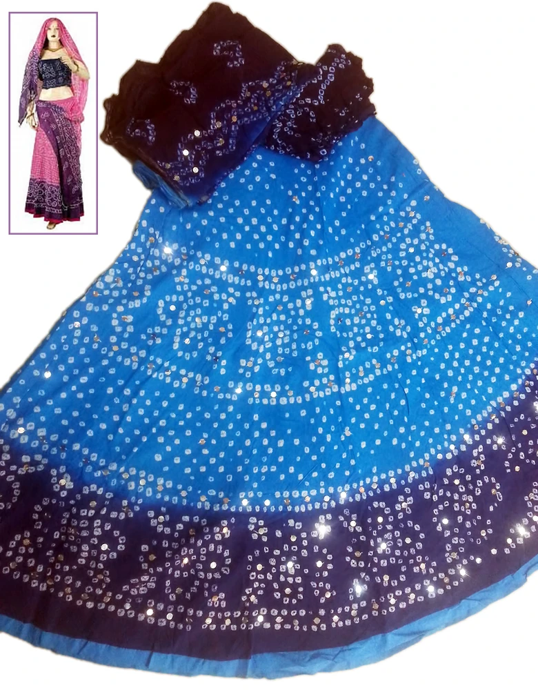 Bandej Lehenga. Three pieces. Cotton with chadar and choli piece. One size fits all. Available in a variety of colors and patterns. Actual items shipped will vary from product image. Please wash separately the first time.