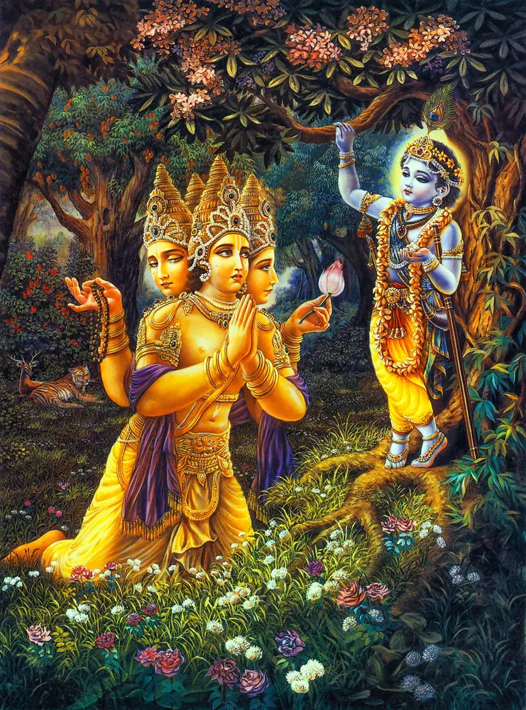 Then Brahma rose very gradually, wiped his eyes, and looked up at Krishna. With his head bent low, his mind concentrated, and his body trembling, Brahma very humbly and falteringly began to offer praises to the Lord.