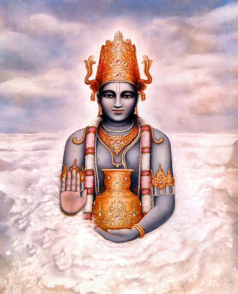 While the demons and demigods churned the ocean of milk, a very wonderful person appeared. He was strongly built; his arms were long, stout, and strong; his neck, which was marked with three lines, resembled a conchshell; his eyes were reddish; and his complexion was blackish. He was very young, he was garlanded with flowers, and his entire body was fully decorated with various ornaments. He was dressed in yellow garments and wore brightly polished earrings made of pearls. The tips ofhis hair were anointed with oil, and his chest was very broad. His body had all good features, he was stout and strong like a lion, and he was decorated with bangles.