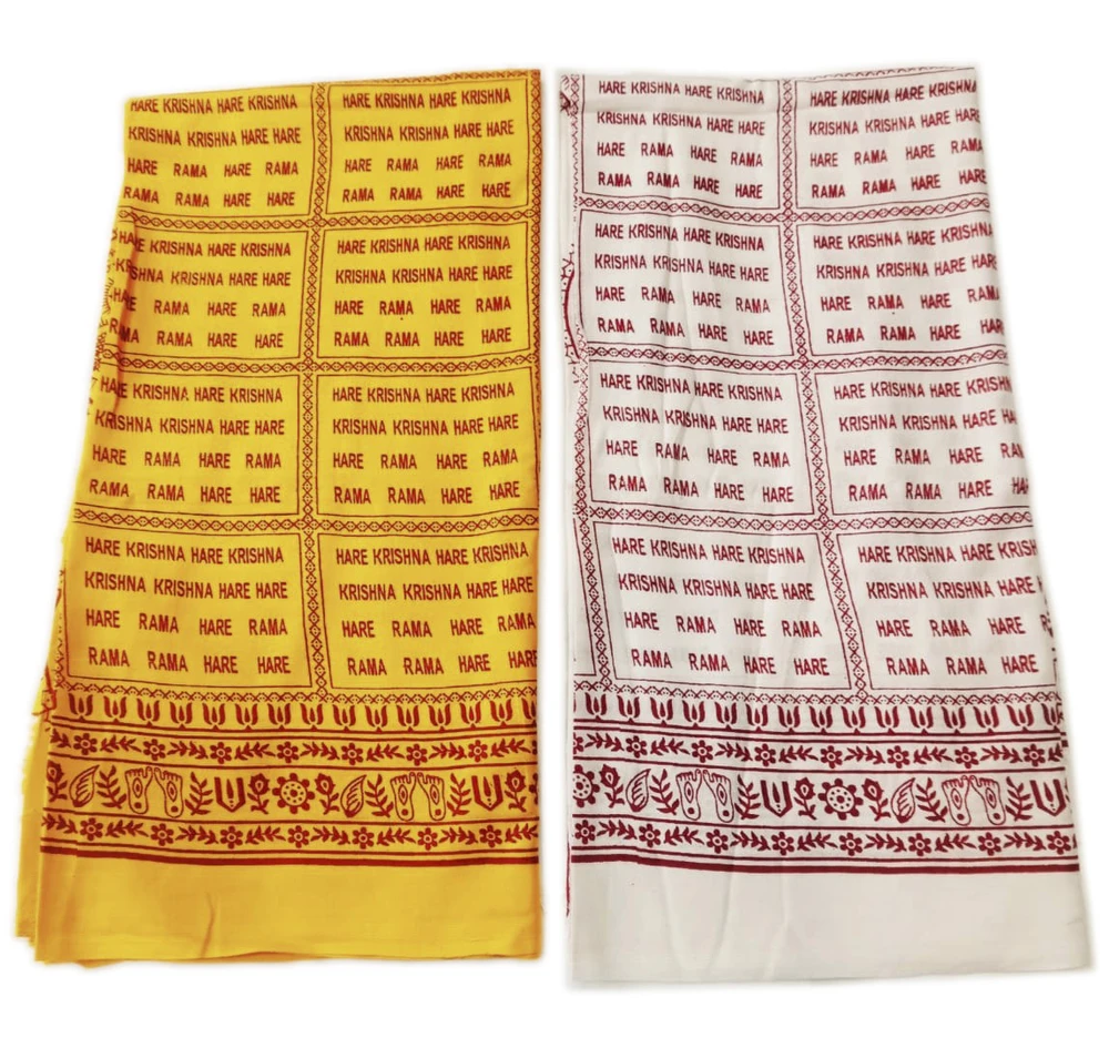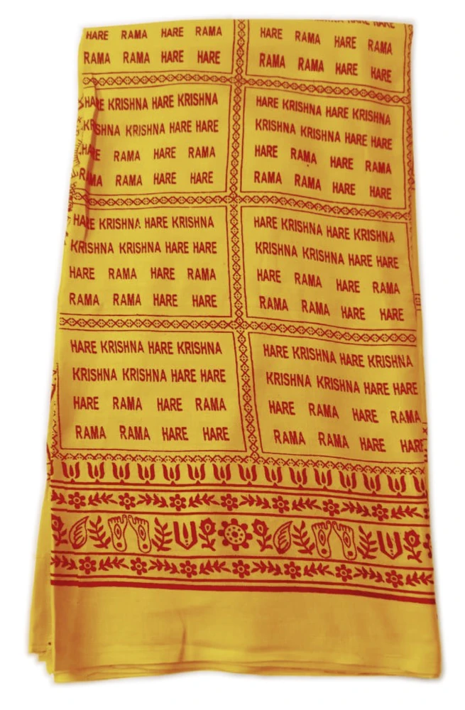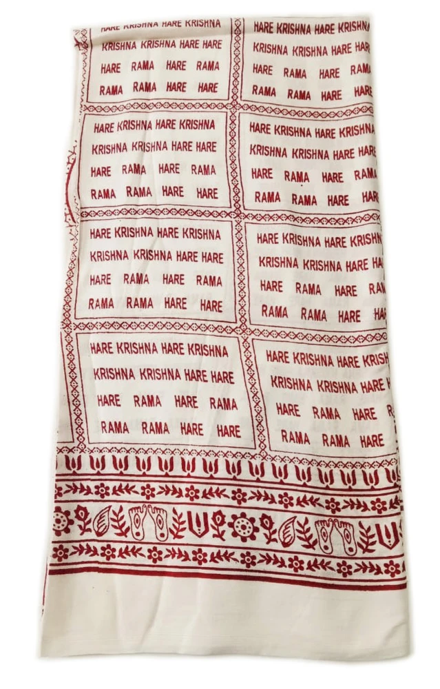 First-class Harinama chadar with Hare Krishna mantra in English. Very good Harinama chadar for use in English speaking countries. This is made from jute which is softer than the usual cotton and preferred by some devotees.