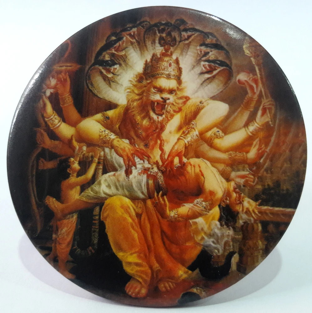 Quality Nrsimhadeva Folding Altar Stand, round 3 inches diameter. Folding stand at the back. Made of thick PVC. Perfect for adding Lord Nrsimhadeva to your alter.