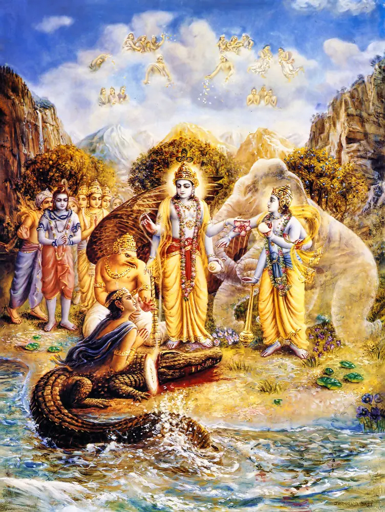 Nonetheless, in his birth as an elephant, when he was attacked by the crocodile, he remembered his past life in devotional service and also remembered a prayer he had learned in that life. Because of this prayer, he again received the mercy of the Lord. Thus he was immediately delivered, and he became one of the Lord's four-handed associates.