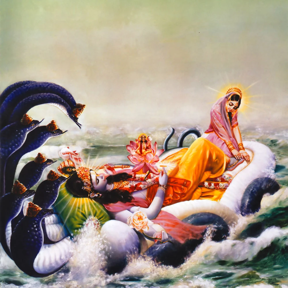Lord Brahma is described as the son of the goddess of fortune, but actually he was not born of her womb. Brahma takes his birth from the abdomen of the Lord Himself. Therefore Laksmiji's massaging of the thighs of the Lord should not be taken as the behavior of an ordinary wife. The Lord is transcendental to the behavior of the ordinary male and female.