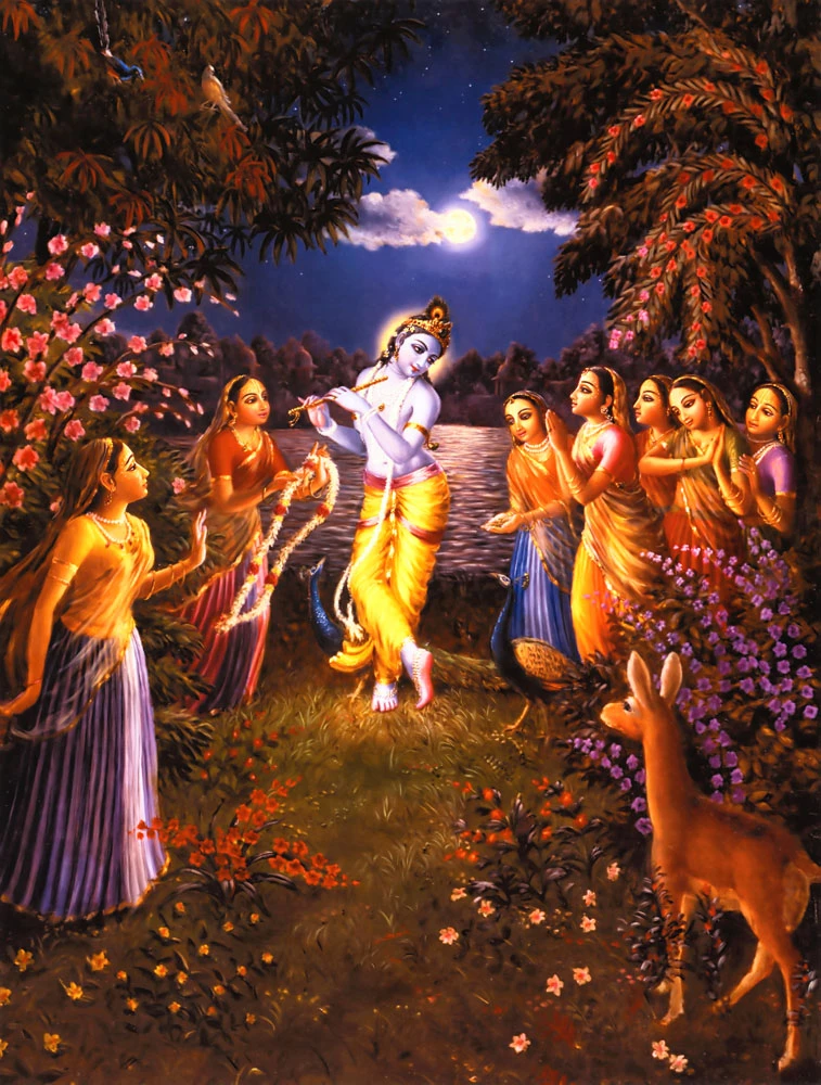 Krishna's beauty and character create a festival for all women. Indeed, when the demigods' wives flying in airplanes with their husbands catch sight of Him and hear His resonant flute-song, their hearts are shaken by Cupid, and they become so bewildered that the flowers fall out of their hair and their belts loosen.