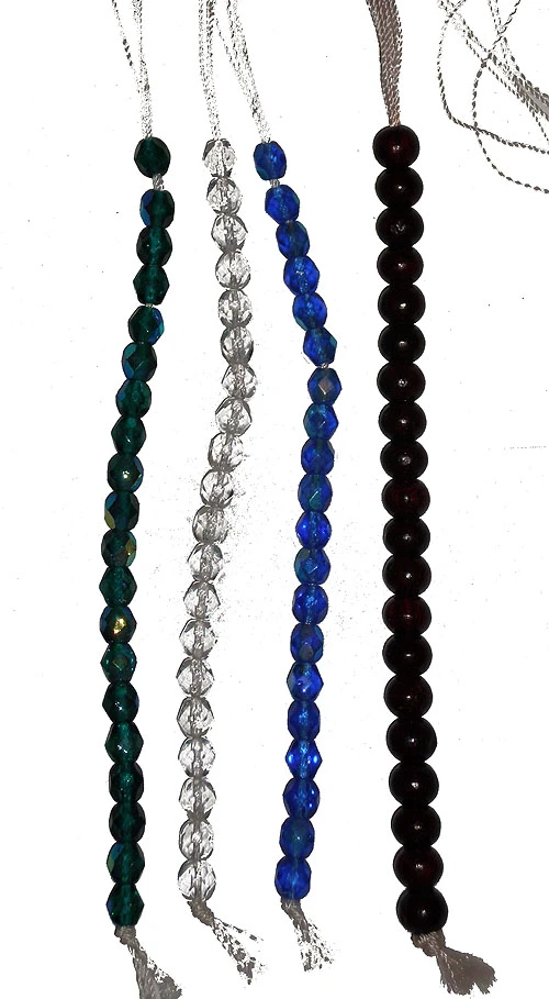 The traditional way of keeping track of the number of rounds of the Hare Krishna mantra we have chanted is to use "counting beads." These japa counting beads are small beads on a string that one attaches to the outside of the bead bag and each time he chants a round he moves one bead down. This way there is always an accurate count of how many rounds of the Hare Krishna mantra have been chanted.