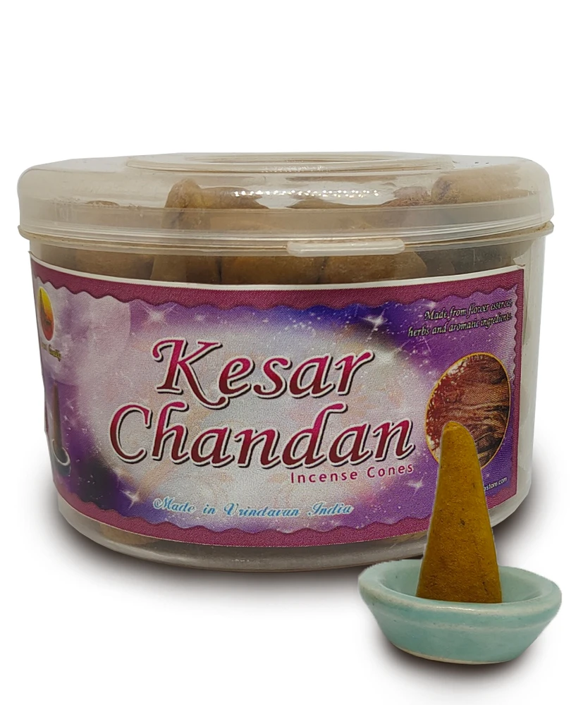Kesar Chandan incense cones are made from pure flower essences, herbs and aromatic ingredients. It's differ from the ordinary incense cones as they are 100% scented material and made from Vrindavan, India.