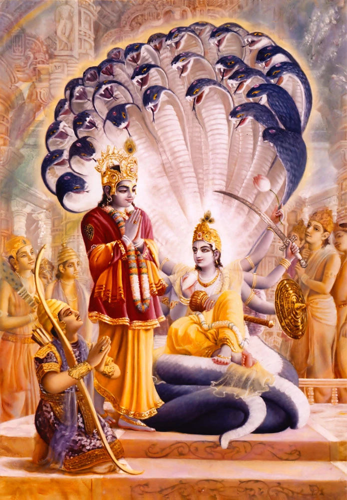 Within that palace, Arjuna and Krishna saw Lord Maha-Vishnu lying very comfortably on the very soft, white body of Sesa Naga, a great serpent with thousands of hoods, each one of them decorated with valuable, effulgent jewels. Lord Maha-Vishnu appeared all-pervading and very powerful, and Arjuna could understand that the Supreme Personality of Godhead in that form is known as Purusottama, the supreme or best Personality of Godhead.