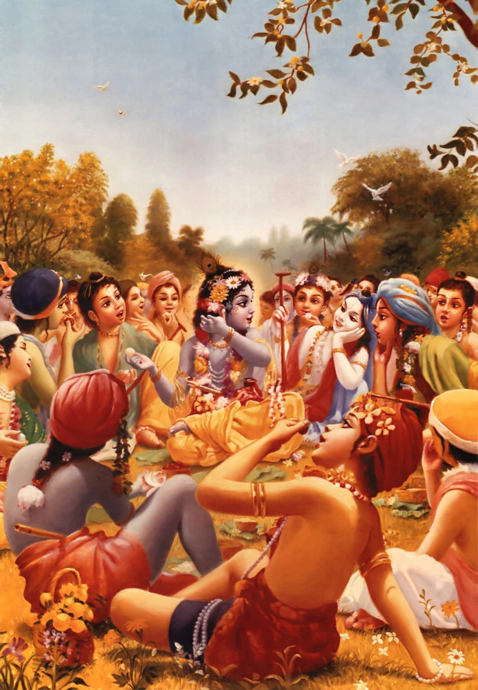 In the fraternal relationship, there is a sense of equality between Krishna and His friends. The playmates of Krishna, the friends of Krishna, never want Krishna to show His opulences. They are so immersed in pure love that they do not even know that Krishna is the Supreme Personality of Godhead. In their loving exchange they forget that Krishna is the Supreme Lord.