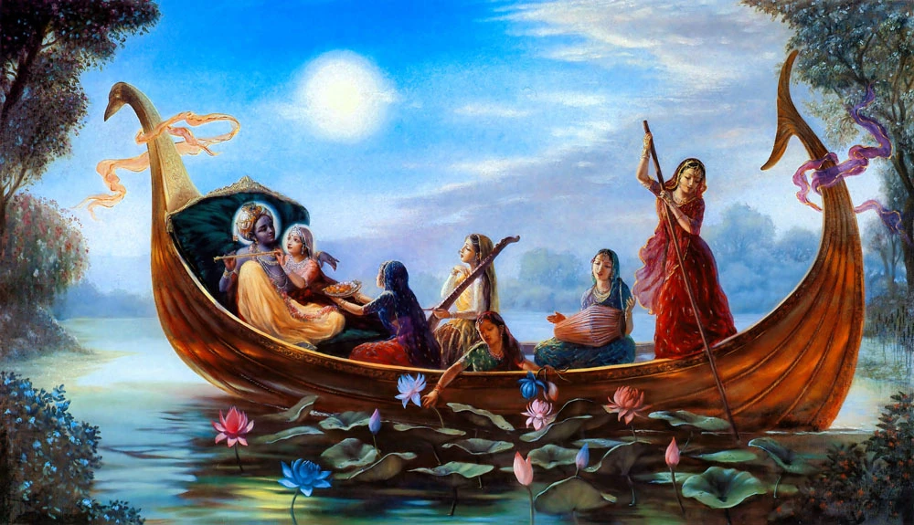 When the young women of Vrindavan heard Krishna's flute-song, which arouses romantic feelings, their minds were captivated by the Lord, and they went to where their lover waited. Among the assembled gopis, the infallible Lord Krishna appeared just like the moon surrounded by stars. He whose activities are so magnanimous made their faces blossom with His affectionate glances, and His broad smiles revealed the effulgence of His jasmine-bud teeth.