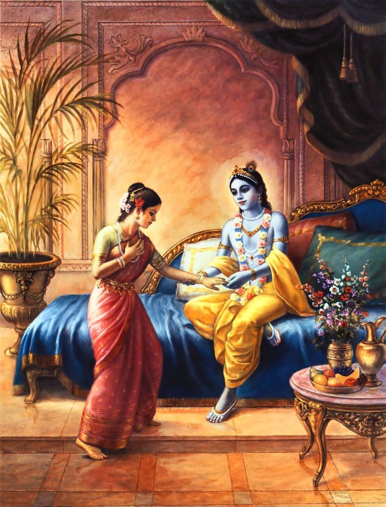 Krishna quickly went to her bedroom. Kubja hesitated to come before Him, but Krishna immediately caught hold of her hand, which was decorated with bangles. With great affection, He dragged her near Him and made her sit by His side. Simply by having previously supplied pulp of sandalwood to the Supreme Lord, Krishna, Kubja became free from all sinful reactions.