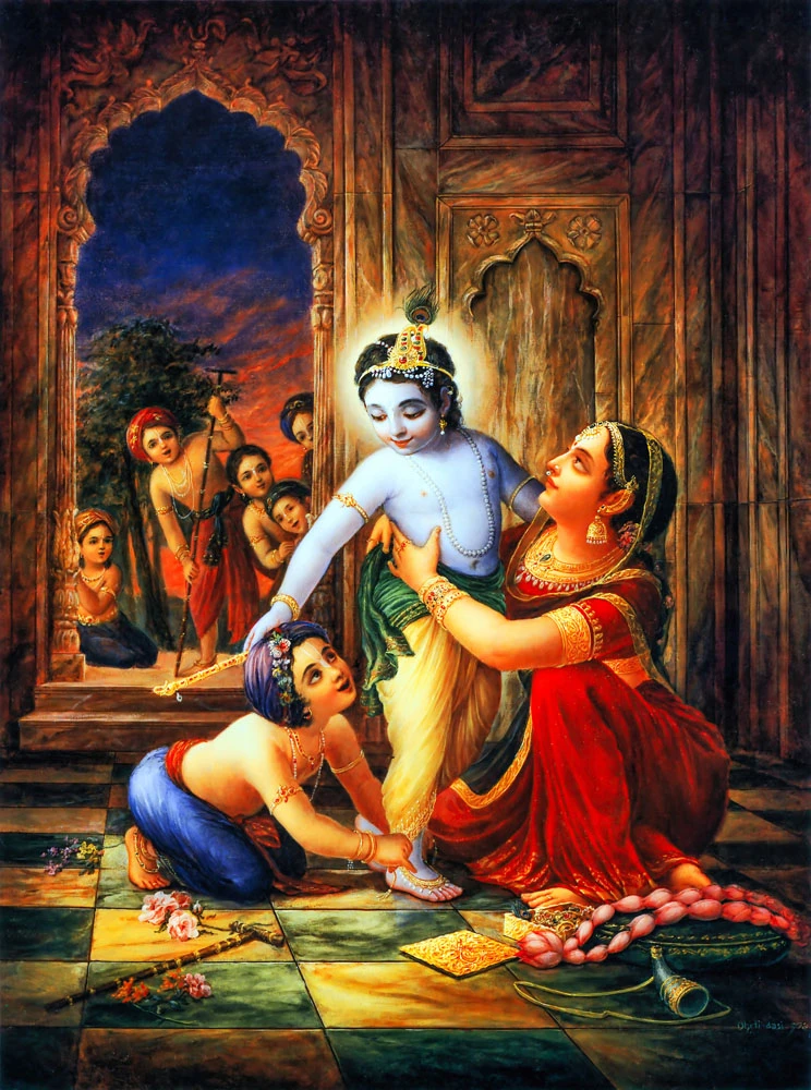 At that time, mother Yasoda scolded the children and told Krishna, "My dear Krishna, do You think that You are a street boy? You have no home? Please come back to Your home! I see that Your body has become very dirty from playing since early morning. Now come home and take Your bath. Besides, today is Your birthday ceremony; therefore You should come back home and give cows in charity to the brahmaṇas. Don't You see how Your playmates are decorated with ornaments by their mothers? You should also be cleansed and decorated with nice dress and ornaments. Please, therefore, come back, take Your bath, dress Yourself nicely, and then again You may go on playing."