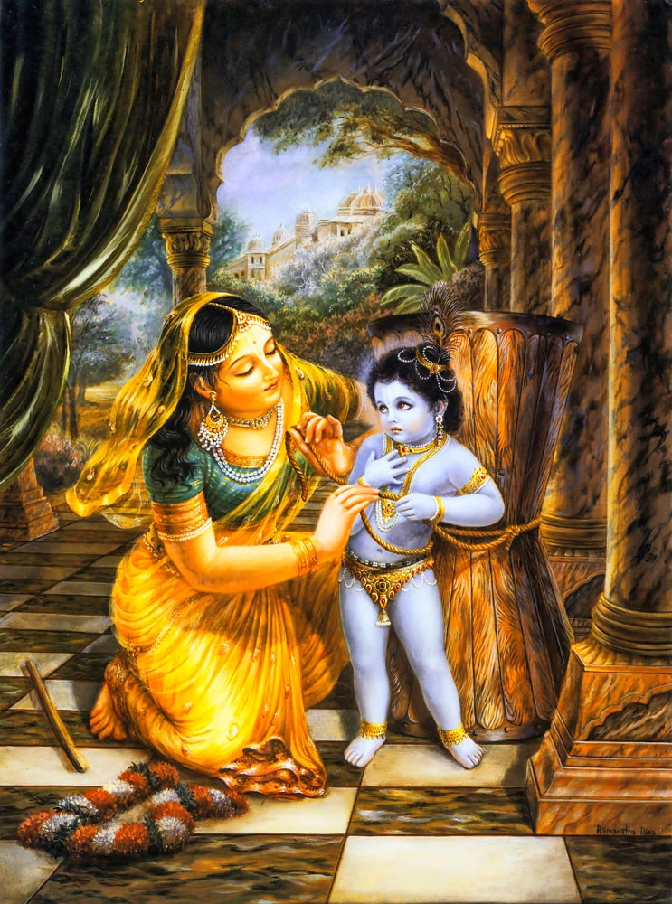 Thus mother Yasoda joined whatever ropes were available in the household, but still she failed in her attempt to bind Krishna. Mother Yasoda's friends, the elder gopis in the neighborhood, smiled and enjoyed the fun. Similarly, mother Yasoda, although laboring in that way, also smiled. All of them were struck with wonder. Because ofmother Yasoda's hard labor, her whole body became covered with perspiration, and the flowers and comb fell from her hair.When child Krishna saw His Mother thus fatigued, He became merciful to her and agreed to be bound. The entire universe, with its great, exalted demigods like Lord Siva, Lord Brahma, and Lord Indra, is under the control of the Supreme Personality of Godhead. Yet the Supreme Lord has one special transcendental attribute: He comes under the control ofHis loving devotees. This was now exhibited by Krsna in this pastime.