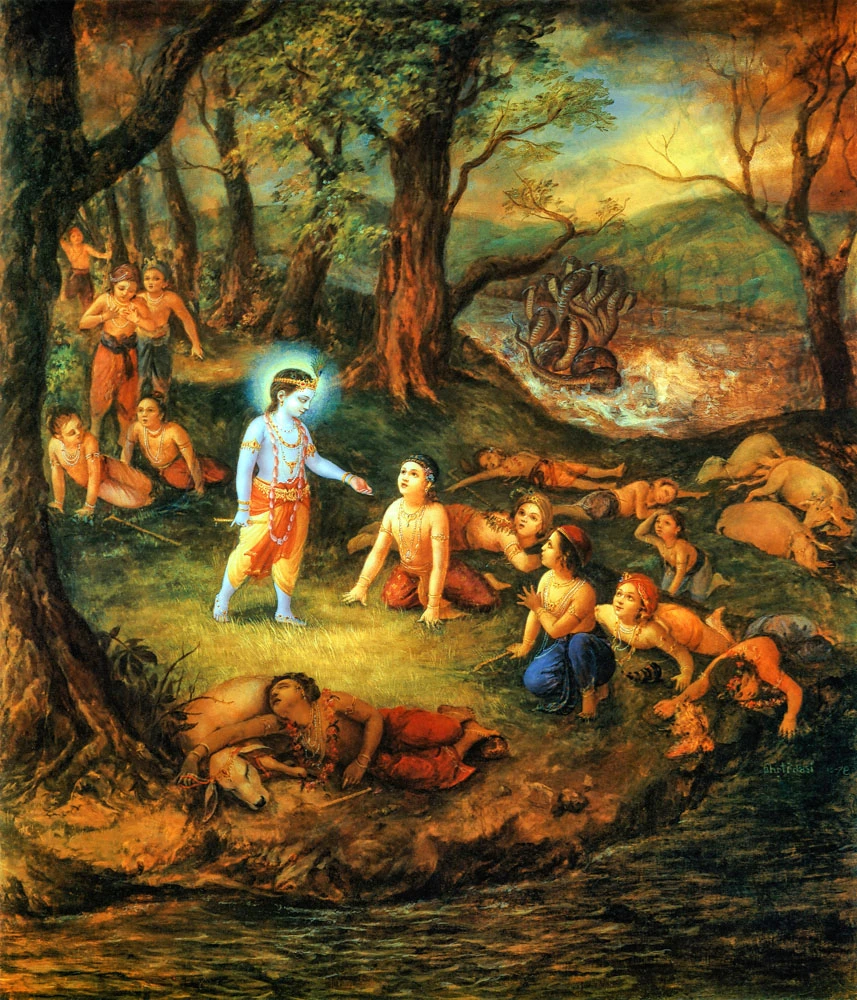 Regaining their full consciousness, the cows and boys stood up out of the water and looked at one another in great astonishment. They realized that although they had drunk poison and died, simply by the merciful glance of Govinda they had regained their lives and stood up by their own strength.