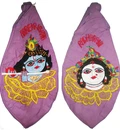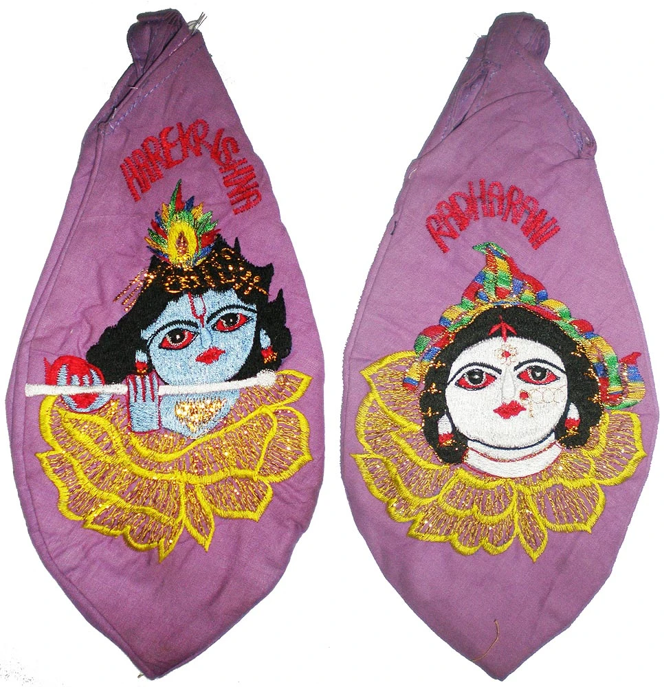 Beautiful embroidered Krishna in mid of Flower Petals with Radha on Back Japa Bead Bag. For holding Japa Mala while chanting Japa. Has an picture of Lord Krishna on the front and Srimati Radharani on the back.