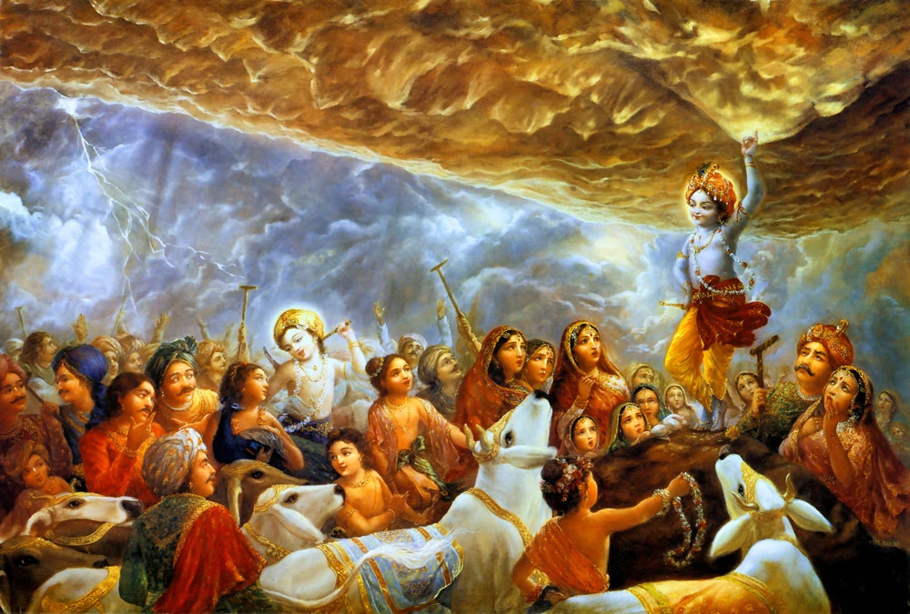 Thus assured by Lord Krishna, all the inhabitants of Vrndavana went under the great hill with their property and animals. They all remained there for one week without being disturbed by hunger, thirst, or any other discomforts. After seven days, Indra finally understood Krishna's mystic power and ordered the clouds to withdraw.