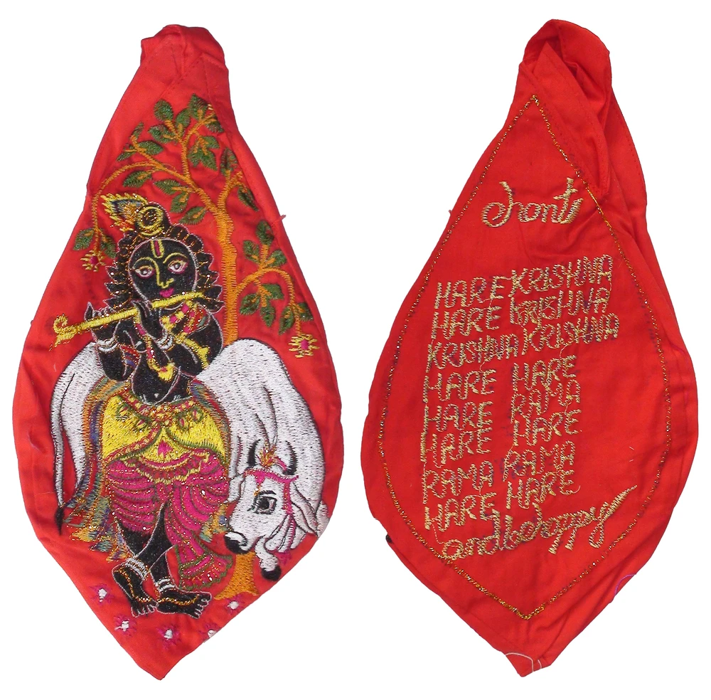 Embroidered japa bead bag with Krishna playing His flute in front of a cow on the front and the full Hare Krishna maha-mantra on the back. Large size. Includes zip pocket.