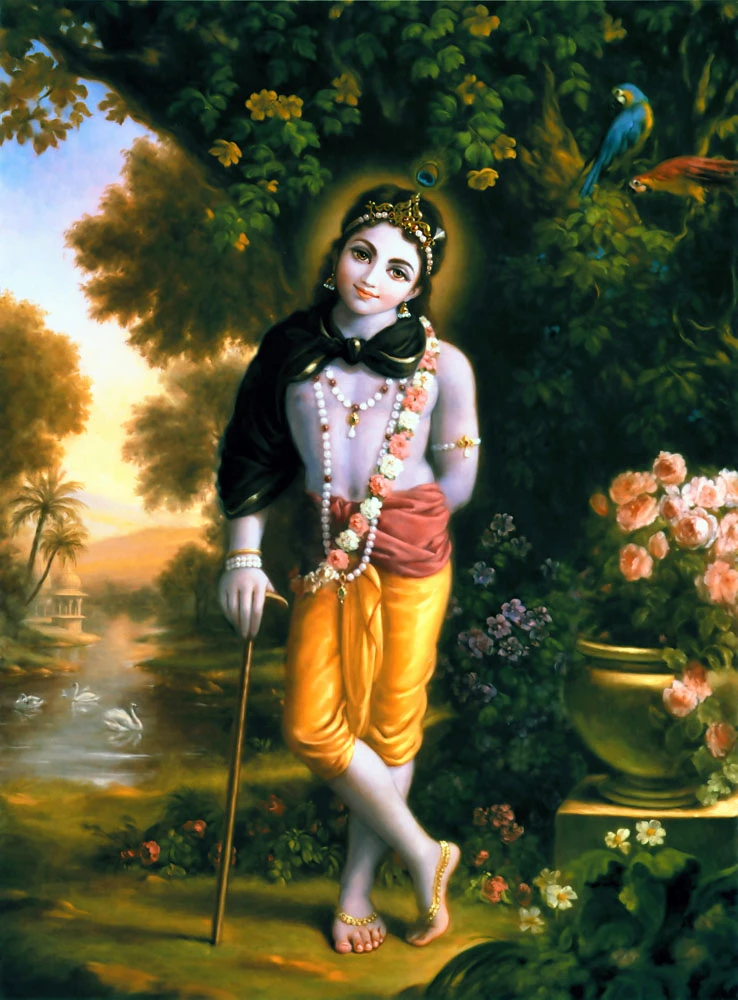 Krishna is the master of all demigods, including Lord Brahma, Lord Siva and the expansion of Vishnu within this universe. Therefore no one is equal to or greater than Him. The most confidential residence of Krishna is Goloka Vrndavana. It is there that He stays with His father, mother and friends, exhibits His transcendental relationships and bestows His mercy amongst His eternal entourage.