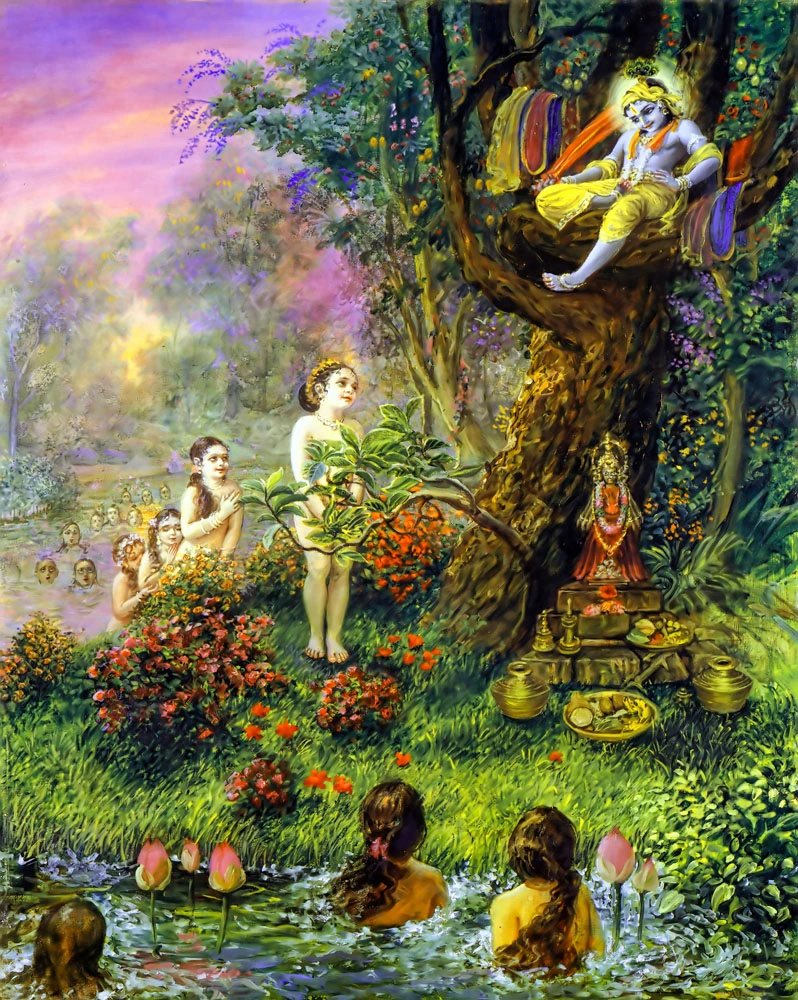 Then the girls, shivering from the cold, climbed out of the water with their two hands covering their private parts. Krishna felt great affection for them and said, "Because while executing a vow you bathed in the water naked, you have committed an offense against the demigods, and to counteract it you should offer obeisances with palms joined above your heads. Then your vow of austerity will achieve its full result."