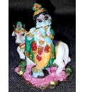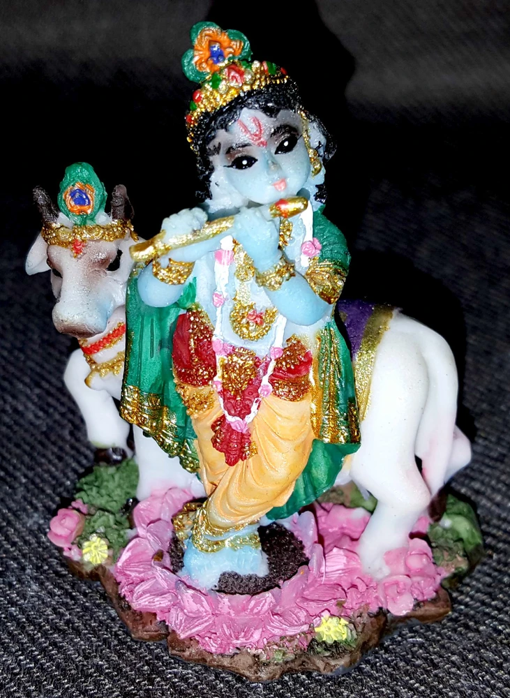Beautiful hand painted polyresin figure of Krishna with a Cow. Approximately 2.5 inches high. Small size. Good for keeping in the car to remind you of Krishna always.