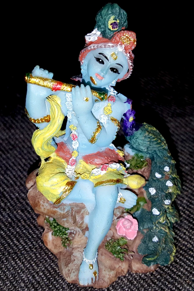 Beautiful hand painted polyresin figure of Krishna with a peacock. Small size. Approximately 2.5" high. Good for keeing in the car to remember Krishna always even while driving.