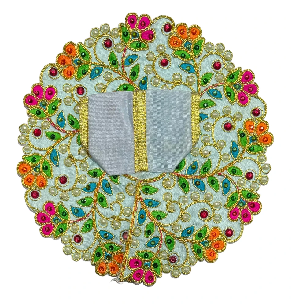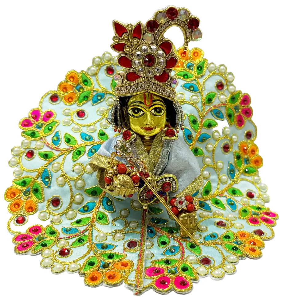 This Laddu Gopal attire features a serene light blue base adorned with intricate golden embroidery and vibrant floral patterns. The dress is embellished with colorful gem accents in shades of pink, orange, and green, along with shimmering pearls. Its beautifully crafted design adds a divine and festive charm, perfect for special occasions.