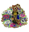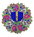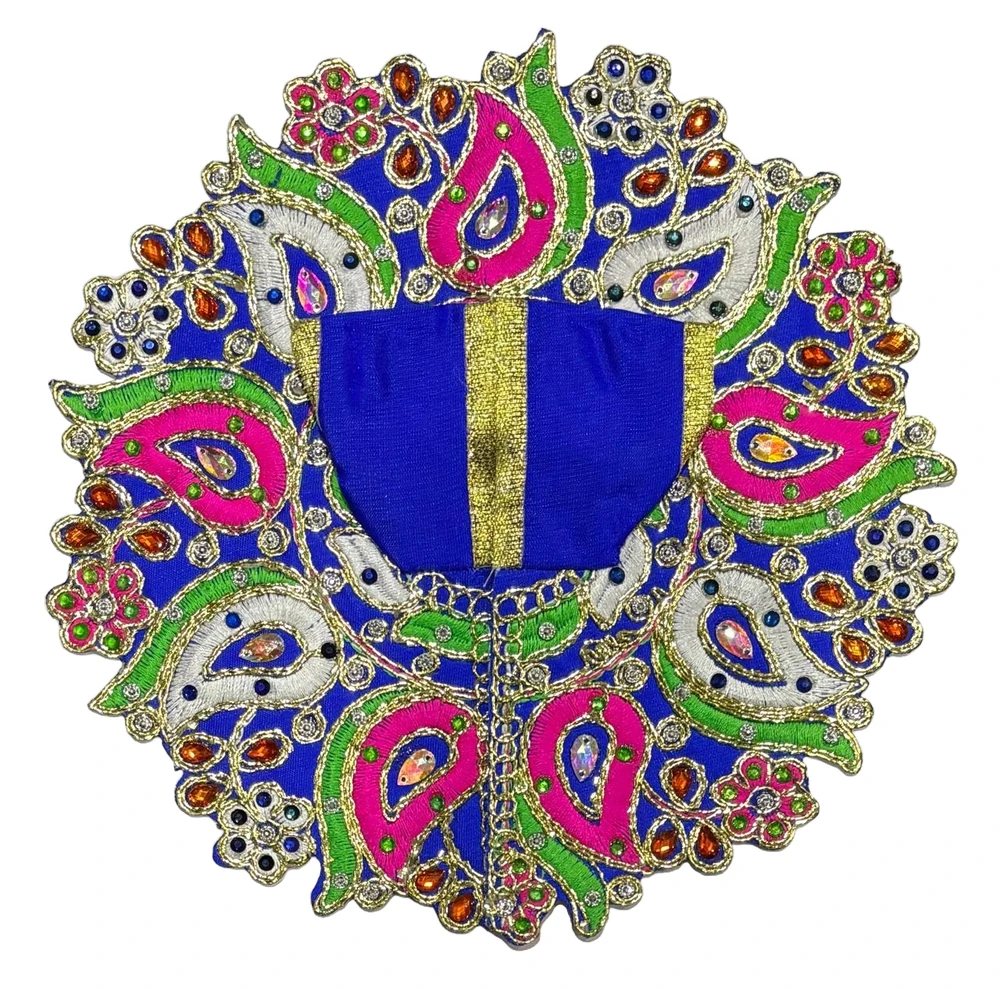 This Laddu Gopal attire features a royal blue base with vibrant paisley-inspired embroidery in shades of green, pink, and silver. The intricate golden detailing, along with sparkling gems and pearls, adds a regal touch. The colorful design and elegant craftsmanship make this dress perfect for devotional and festive occasions.