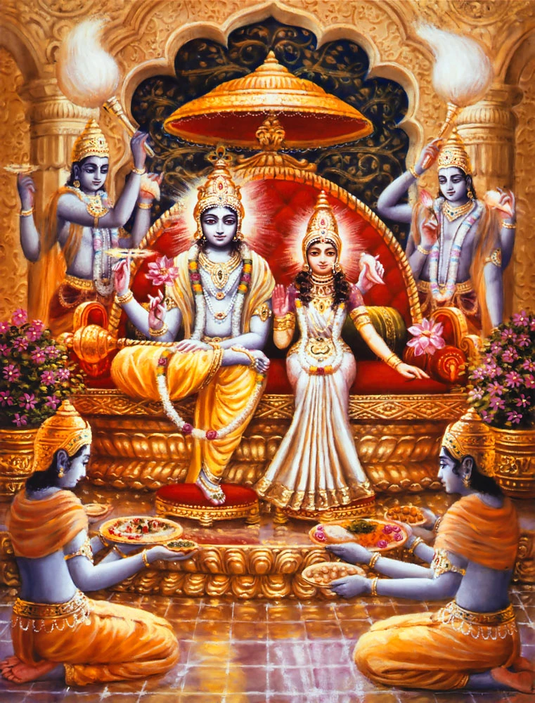 Mother Laksmi is the reservoir of all spiritual qualities, whereas You are the support of all such names and forms and the cause for their manifestation. You and she are the supreme rulers and benedictors of the three worlds. Therefore, my Lord, may my ambitions be fulfilled by Your grace.
