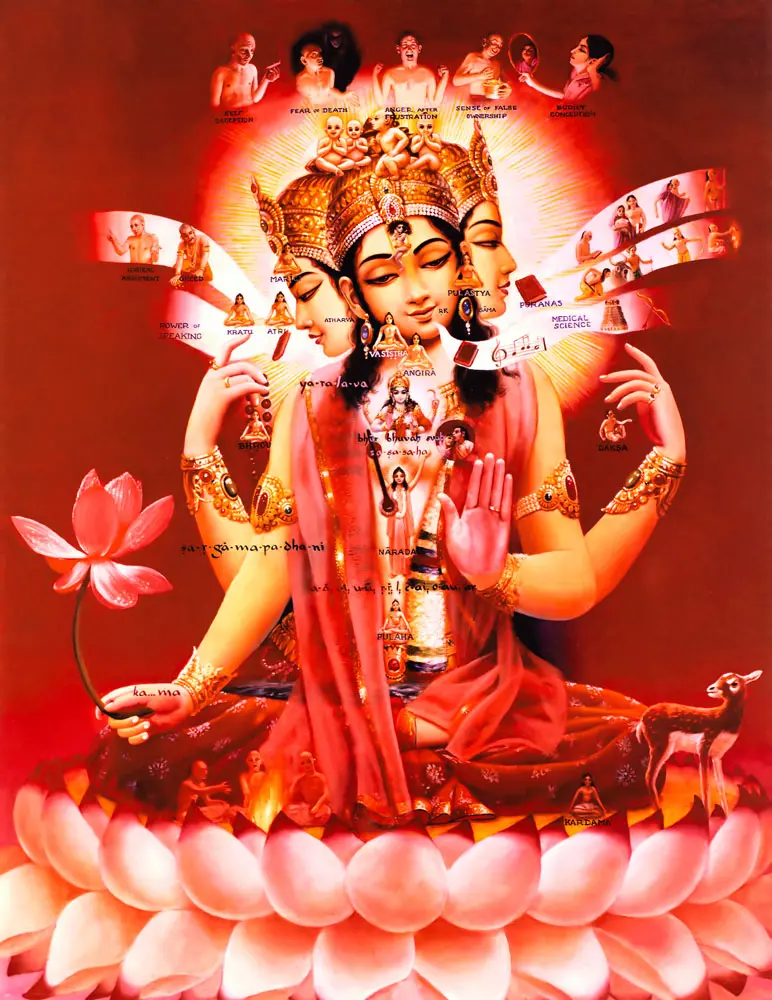 The qualities of nescience, the great sages, sacrificial paraphernalia, social duties, the Vedic hymns, the arts and sciences, the letters of the alphabet--these and many other aspects of the cosmic manifestation--were generated from the body and mind of Lord Brahma.