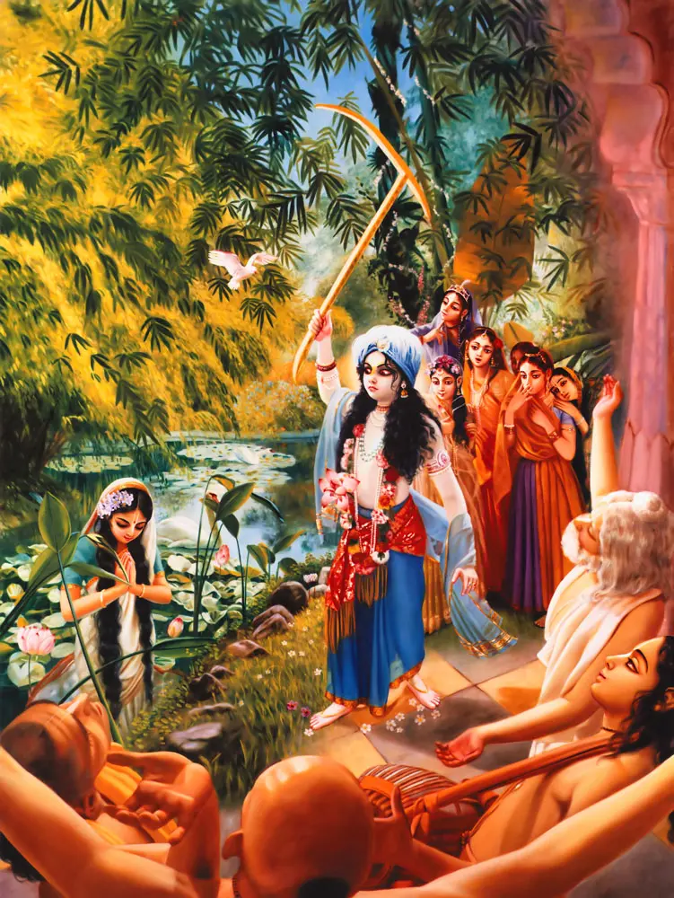 When the Lord, in His ecstasy of Baladeva, was moving as if intoxicated by the beverage, Advaita Acarya saw Him in the form of Balarama. Vanamali Acarya saw a golden plow in the hand of Balarama, and the devotees all assembled together and danced, overwhelmed by ecstasy. In this way they danced continuously for twelve hours, and in the evening they all took bath in the Ganges and then returned to their homes.