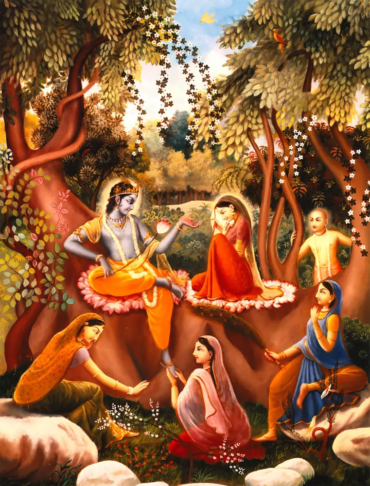 "After hearing the vibration of a flute, I went to Vrindavan, and there I saw that Krishna, the son of Maharaja Nanda, was playing on His flute in the pasturing grounds. He brought Srimat Radharani to a bower by signaling with His flute. Then He entered within that bower to perform pastimes with Her. I entered the bower just behind Krishna, My ears captivated by the sound of His ornaments. I saw Krishna and the gopis enjoying all kinds of pastimes while laughing and joking together. Hearing their vocal expressions enhanced the joy of My ears."
