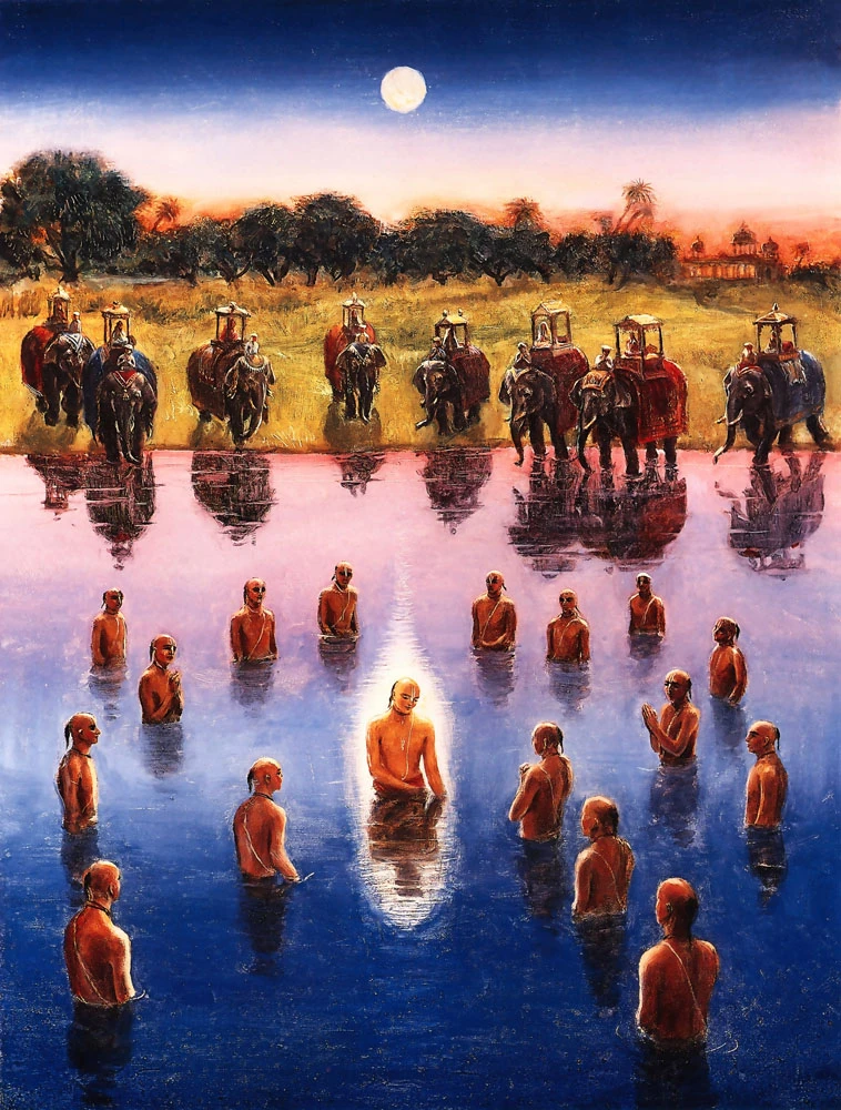 When the king heard that the Lord was leaving that evening, he immediately made arrangements for some elephants with small tents on their backs to be brought there. Then all the ladies of the palace got on the elephants. All these ladies went to the road the Lord was taking and remained there in a line. That evening, the Lord departed with His devotees.