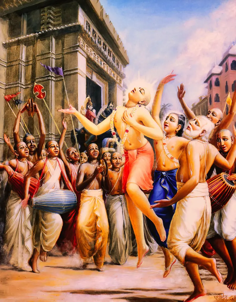 As the circumambulation was performed, the four kirtana parties sang in front and in the rear. While kirtana was going on, there was a transformation of ecstatic love and much tears, jubilation, trembling, perspiration and deep resounding in the body of Sri Caitanya Mahaprabhu. Upon seeing this transformation, all the people present became very much astonished.