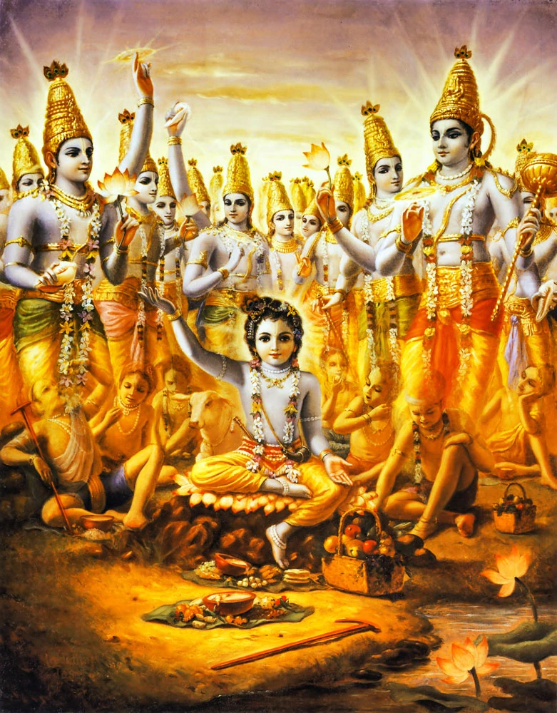 After nearly a year, Baladeva observed that all the cowherd boys and calves were expansions of Krishna. Thus He inquired from Krishna and was informed of what had happened. When one full year had passed, Brahma returned and saw that Krishna was still engaged as usual with His friends and calves. Then, as Brahma looked on, Krishna exhibited all the calves and cowherd boys as four-armed forms of Narayana. The calves and the boys were suddenly transformed into personalities possessing complexions the color of bluish rainclouds and wearing garments of yellow silk. All those personalities had four arms and held a conchshell, a disc, a mace, and a lotus in Their hands. They wore helmets, earrings, armlets, bracelets, and garlands of forest flowers, and on the upper portion of the right side of Their chests They bore the emblem of the goddess of fortune. With the Kaustubha gem hanging around Their necks, which were marked with three lines like a conchshell, as well as bangles on Their ankles, ornaments on Their feet, and sacred belts around Their waists, They all appeared very beautiful. Every part of Their bodies, from Their feet to the top of Their heads, was fully decorated with garlands of fresh, tender tulasi leaves. These garlands had been offered by devotees engaged in worshiping the Lord by the greatest pious activity, namely hearing and chanting His glories.