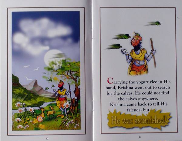 All the gopas sat around Krishna and opened their lunch packs with great excitement. "Krishna see! See what I have!" Sridama called out. Krishna bit off a piece of sweet and said, "Mmmmmmm... so tasty."