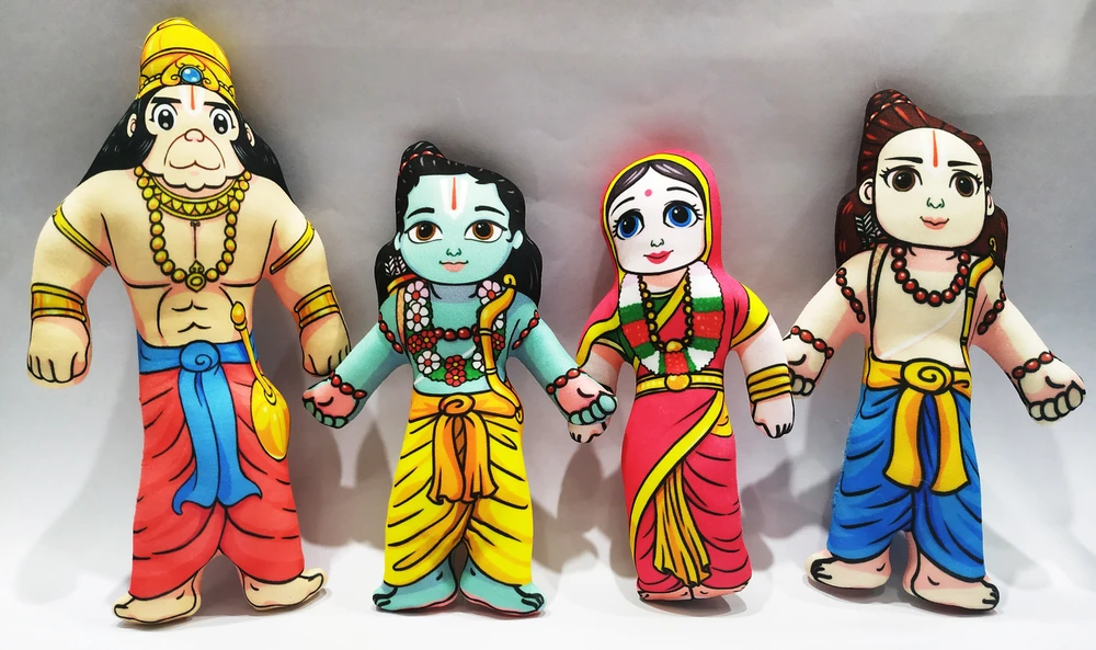 Lord Rama's family -- Sita, Rama,Lakshmanaand Hanuman soft toys. The pastimes of Lord Rama and His family can be remembered easily with joyful playful activities by children with the help of these soft toys. Made from cotton. Filling is cotton fibre.These Krishna Toys are so adorable that children love them very much.Sizes:Hanuman: 8” x 4”,Sita, Rama andLakshmana: 7.5” x 5” (inches). Sizes are approximate.
