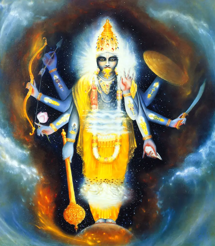 On His shadow was death, in His smile was the illusory energy, and on the hairs of His body were all the drugs and herbs. In his veins were all the rivers, on His nails were all stones, in His intelligence was Lord Brahma, the demigods, and the great saintly persons, and throughout His entire body and senses were all living entities, moving and stationary.
