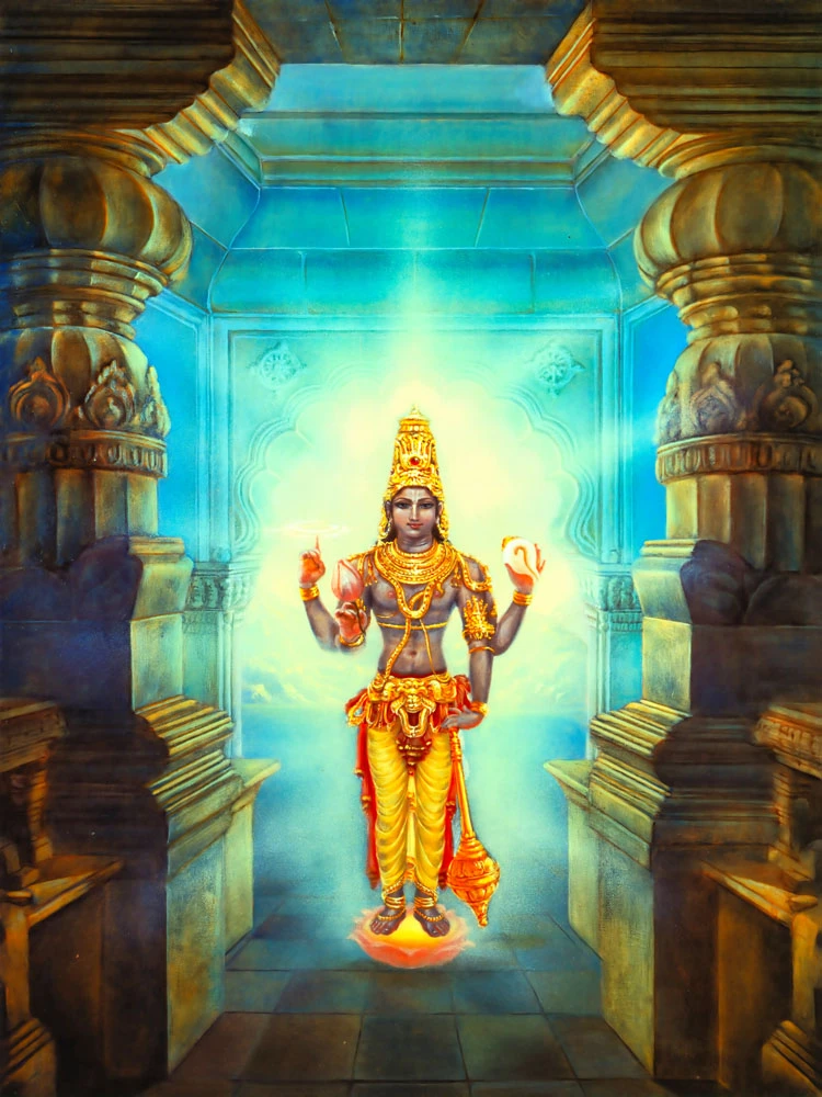 I have fallen in love with this magnificent painting of my lord mahavishnu right from the moment I first saw it. The supremely effulgent lord appearing in a doorway- I am considering this doorway to b...Read moreI have fallen in love with this magnificent painting of my lord mahavishnu right from the moment I first saw it. The supremely effulgent lord appearing in a doorway- I am considering this doorway to be the heart of a devotee, where the supreme lord manifests in all His divine splendour. I love the typical south Indian style of the painting. Colours have been used in moderation so that the brilliance around the lord's person is augmented-it so appears that the whole painting is being illuminated.The serenity and beauty of the lord's face is indescribable.the ornaments are so intricate and lustrous-as befitting the mighty king of the universe.I would like to summarise with these words-a painting with such immense artistic and spiritual beauty that would make it the pride and joy of any puja room. Sri Krishna sharanam mama.Read less