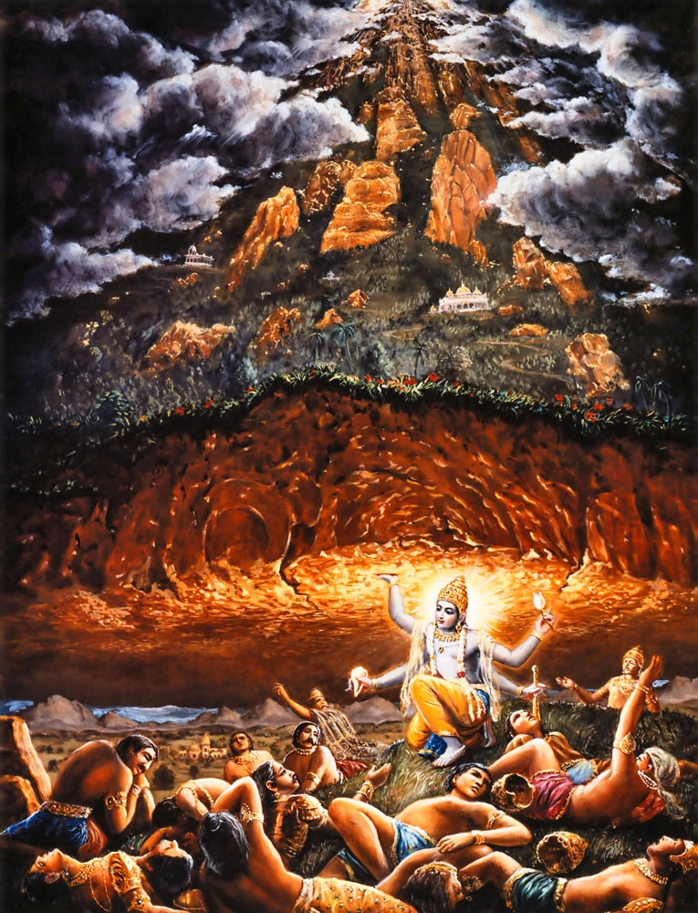 Suddenly, Mandara mountain slipped from their hands, fell down and smashed many demigods and demons. Most of them were killed, and the survivors were frustrated and disheartened, their arms, thighs and shoulders being broken.