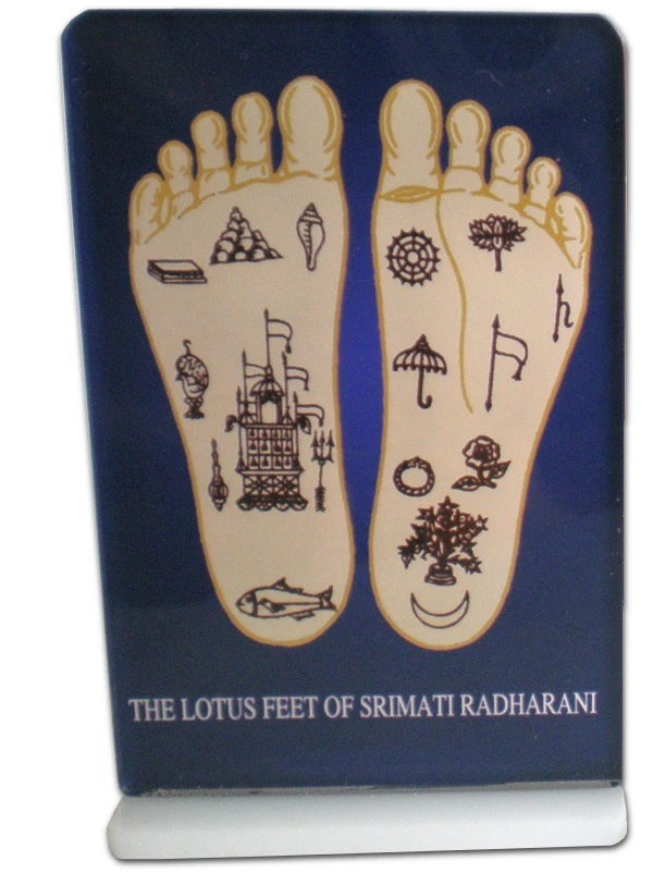 These quality Lotus Feet of Radharani Stands are 3.75" x 2.75" and made of acrylic. They can make a very nice addition to an an altar in a temple or home. You can put it on a desk in your workspace to remind you of Sri Radharani throughout the day.