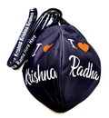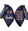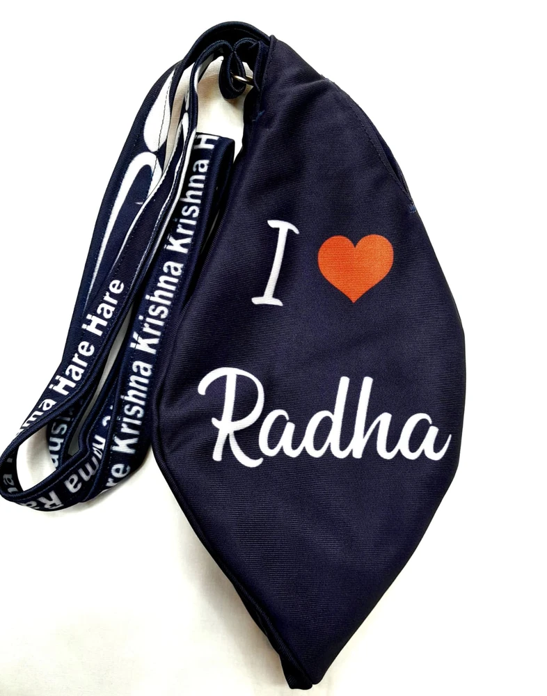 "I Love Radha" with a heart. Stunning colorful standard size bead bag with digital printing on all 3 sides and Hare Krishna Mantra printed on the strap. First class quality cotton japa bead bag.