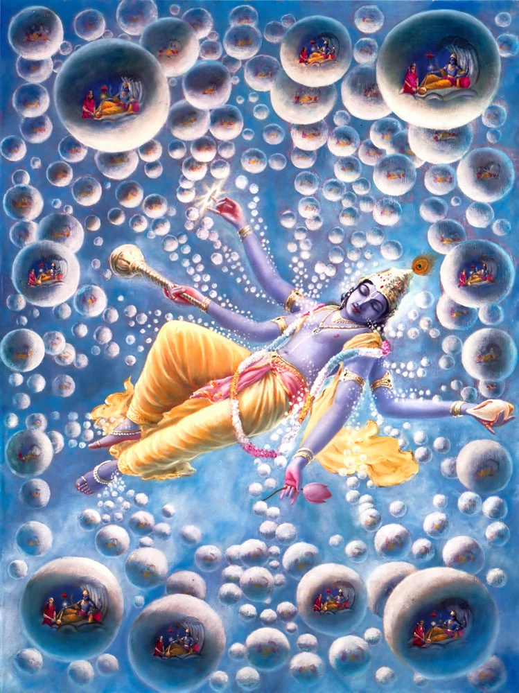 The second expansion, Garbhodakasayi Visnu, enters all the universes to create diversities in each of them. From the navel of Garbhodakasayi Vishnu has sprung the stem of a lotus flower, the birthplace of Brahma, who is the father of all living beings and master of all the demigod engineers.