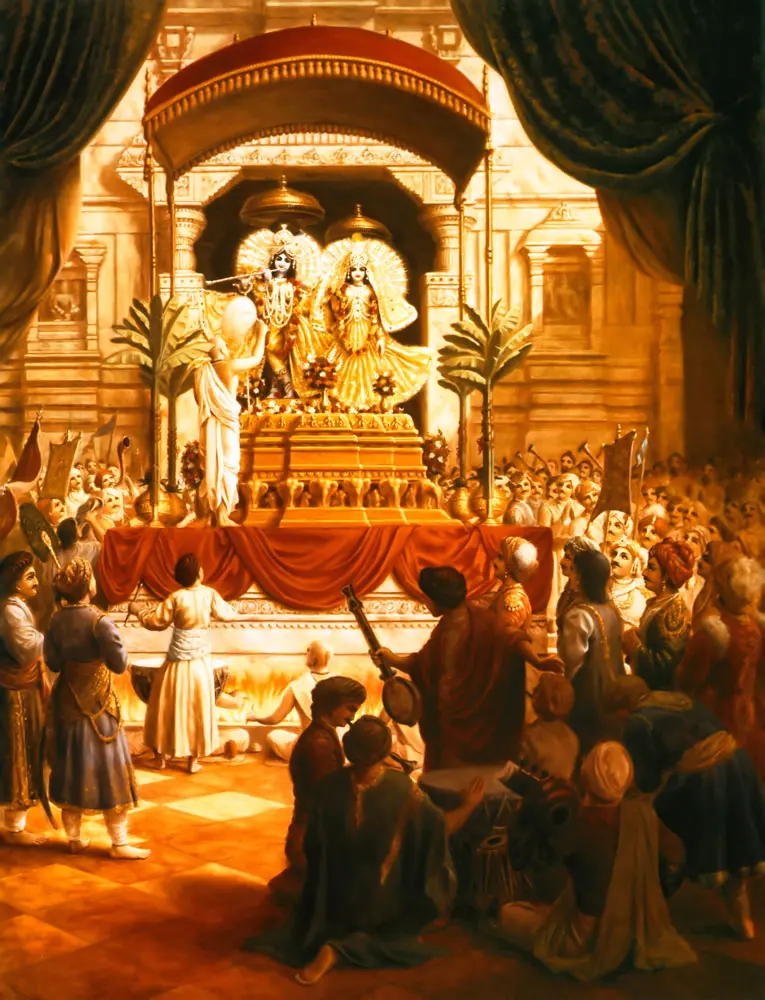 To worship Lord Krishna Maharaja Ambarisa, along with his queen, observed the vow of Ekadasi and Dvadasi for one year. In the month of Kartika, after observing that vow for one year, Maharaja Ambarisa observed a fast for three nights, bathed in the Yamuna and worshiped the Supreme Personality of Godhead, Hari, in Madhuvana.
