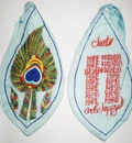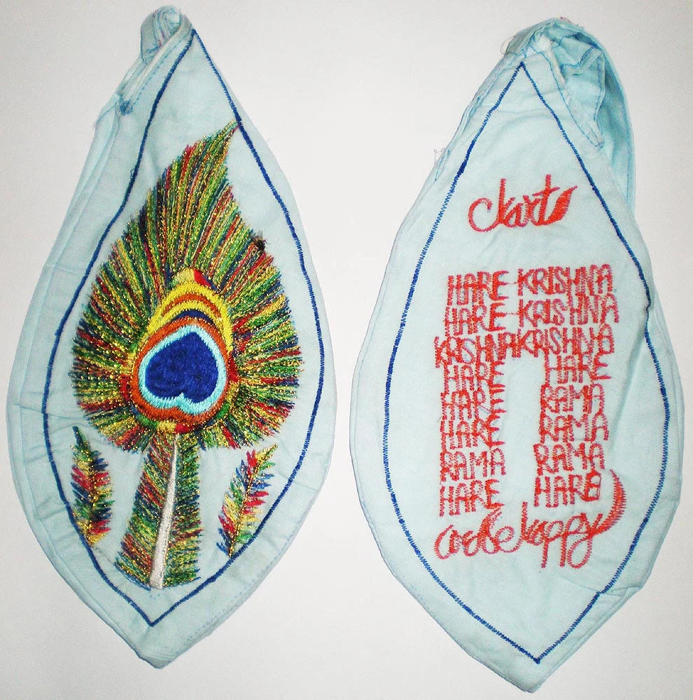 Beautiful embroidered Peacock Feather Bead Bag with Mahamantra on Back. For holding Japa Mala while chanting Japa. Has an picture of Peacock Feather on the front and Maha-Mantra on the back.