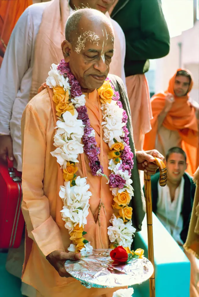 Prabhupada at Airport Holding Plate Covered with Silver Foil and Red Rose