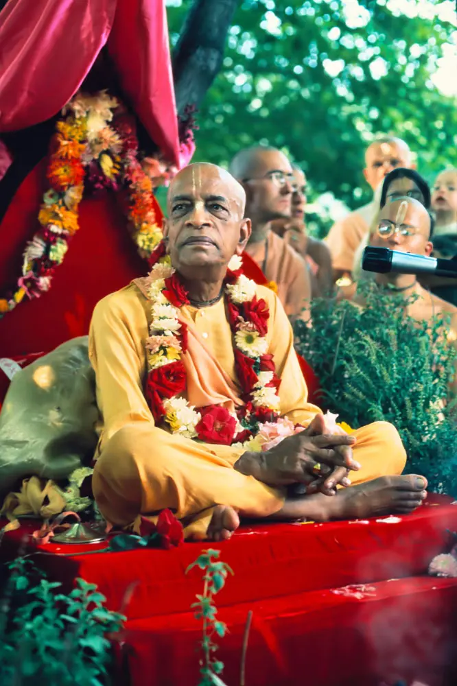 Prabhupada at New Vrindavan Sitting on Vyasasana Outside