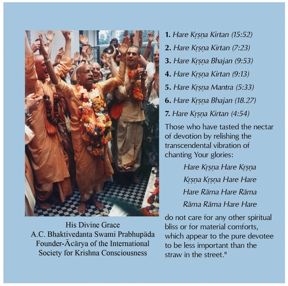 Both Kirtans, (chanting Hare Krishna responsively with devotees) and Bhajans (Srila Prabhupada chanting himself in deep spiritual ecstasy are included). The best, most ecstatic Prabhuapda Kirtan Collection CD ever!