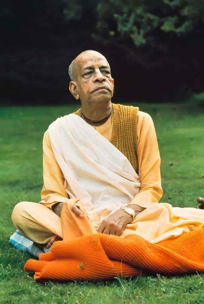 Prabhupada Sitting on Blanket on Grass Chanting Japa